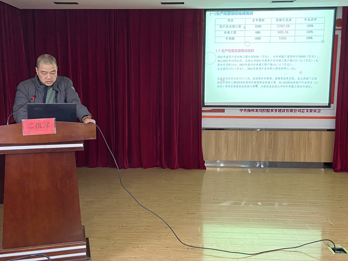 在本次大會匯報交流環節,分別聽取了計劃財務部、運營技術部、黨群工作部、自來水公司、惠民區域供水公司、龍泉建設工程公司、龍川污水處理公司等七個部門單位2021年工作總結報告。各部門、子公司負責人分別圍繞2021年全年生產經營指標、重點工作完成情況、存在的主要問題、解決對策以及2022年工作計劃作了交流匯報。